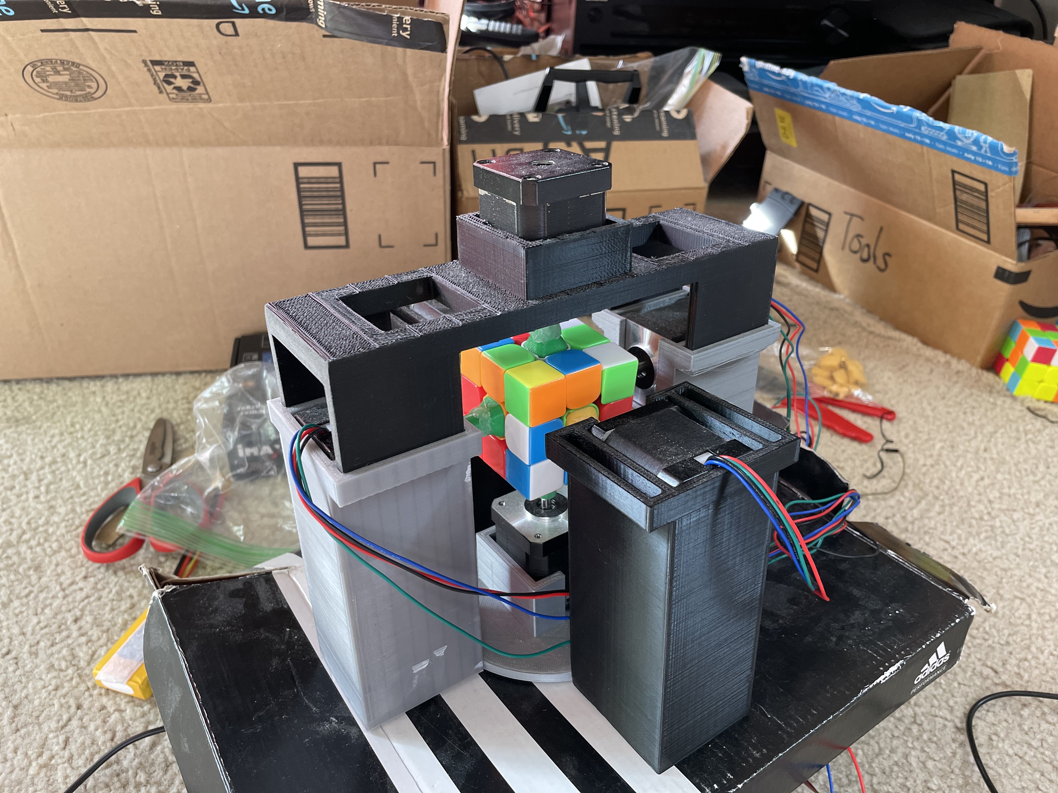 For the adapters to fit snugly onto the motors and into the cubes, the adapter widths had to be slightly larger and smaller than the motor shaft width and cube center piece width, respectively. Too small and it wouldn’t fit, and too large and it would be too loose. Looseness in the adapters made it so that a 90-degree rotation via the stepper motor wouldn’t turn the cube’s face a full 90 degrees, resulting in jams. Thus, the adapters required many iterations to perfect into a just-right size.
