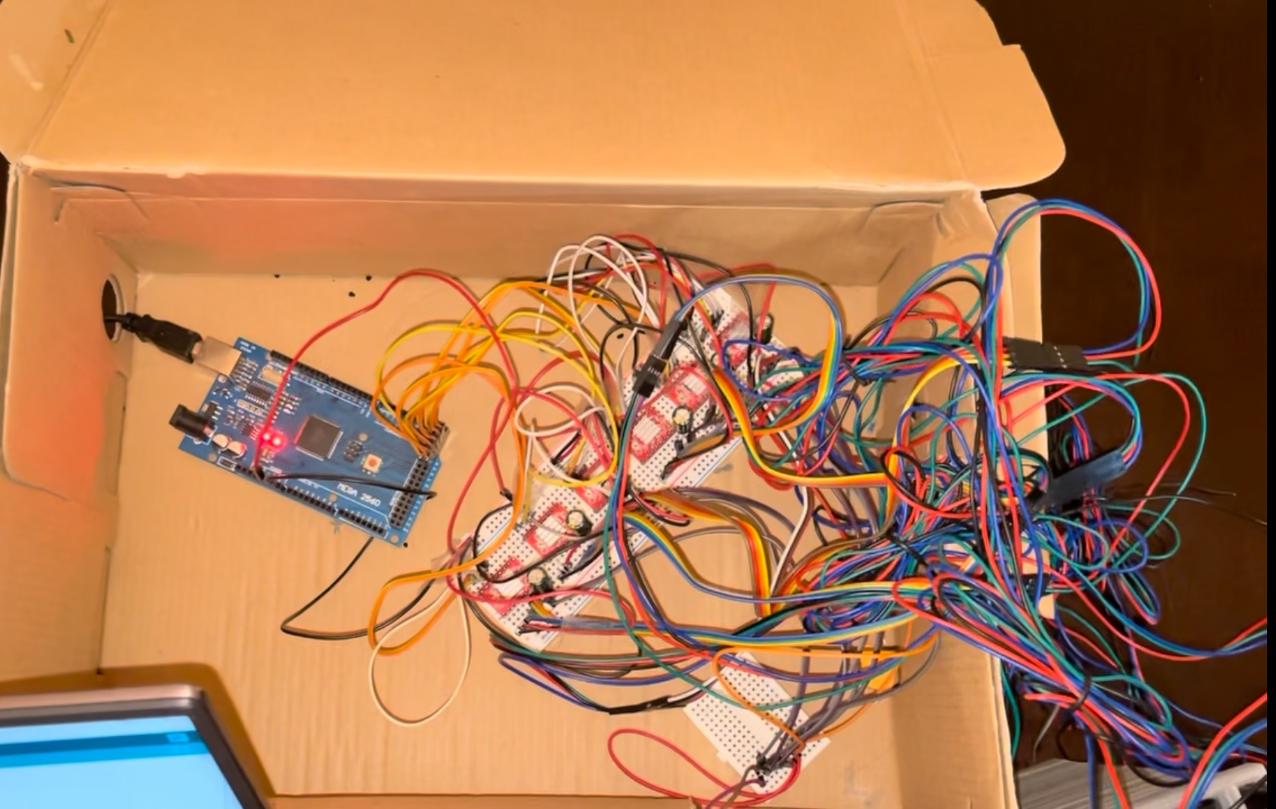 For the electronics, we used 6 stepper motors and 6 corresponding motor drivers that were paired with an Arduino Mega to control the motors. For power, two 3-cell Lipo Batteries were used in serial to generate 24V to the motors. While actual wire harnesses would’ve been cleaner, I opted for the lazier method of just throwing everything into a shoebox!